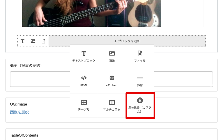 記事編集画面で「埋め込み(カスタム)」を利用