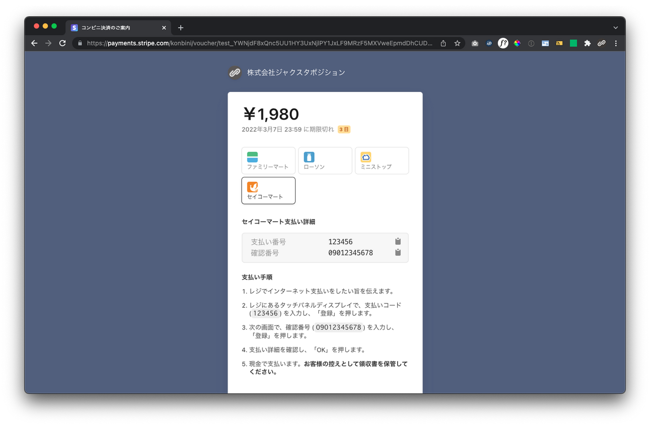 まだコンビニ決済の利用開始になっていないので、以降の画面キャプチャはテストモードでの表示内容になります。
